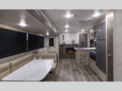 If you enjoy hiking, biking, and fishing, and waking up to beautiful scenery from your own comforts, then start camping with this trailer at the campsite! You will be able to sleep like a queen on the walk-around bed with dual wardrobes and overhead storage for more items in the front private bedroom while your family or friends have their own privacy in the bunkhouse complete with two bunks, a jack knife sofa with storage totes below and a TV/wardrobe cabinet for even more storage. The full bathroom includes the second entry/exit door for convenience when outside under the 21' electric awning with multicolor LED lights, or while cooking using the full-size camper kitchen along the exterior. There are full kitchen amenities inside including a 10.7 cu. ft. refrigerator and a pantry.