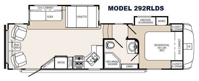 As you enter model 292RLDS notice the two swivel rockers with end table to your left along the rear wall with overhead cabinets above. There is a corner entertainment center on the right as you enter, and a slide out sofa and booth dinette straight ahead inside.